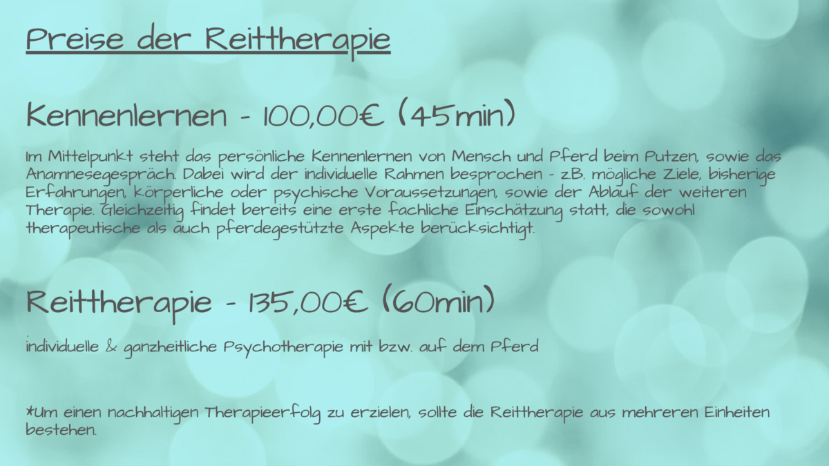 Im Allgemeinen ist die Reittherapie eine freiwillige Leistung des Kostenträgers und keine Regelleistung der gesetzlichen Krankenkassen.